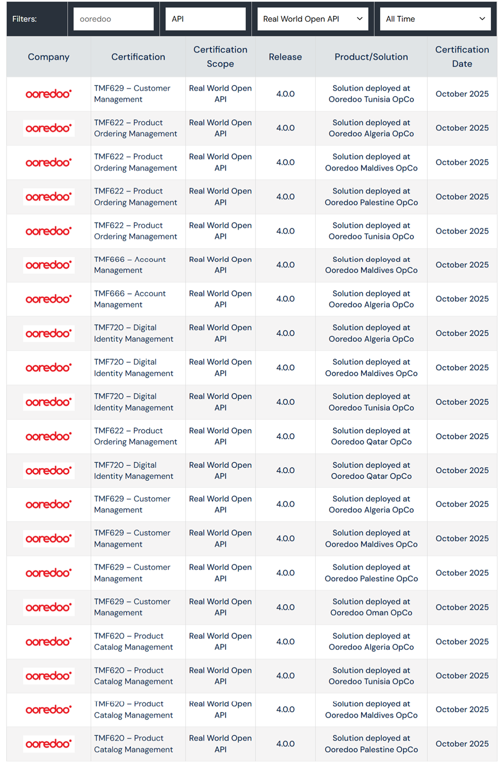 Below are the listed Ooredoo certificates. To view more Ooredoo TMF certificates, please visit the webpage by clicking here